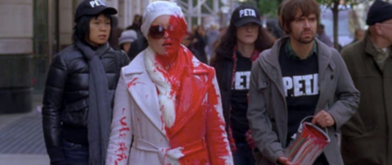 She was referencing one of the more iconic direct action tactics that rose to prominence in the 80s and 90s, where anti-fur and animal rights groups would throw red paint on people wearing fur coats in public. This form of protest became so infamous, it’s entered into pop culture, with references in shows like Sex and the City and 30 Rock, and celebrity fashion statements from the likes of Khloe Kardashian. If you have heard anything about organizations like PETA, you’ve probably heard about the red paint thing.